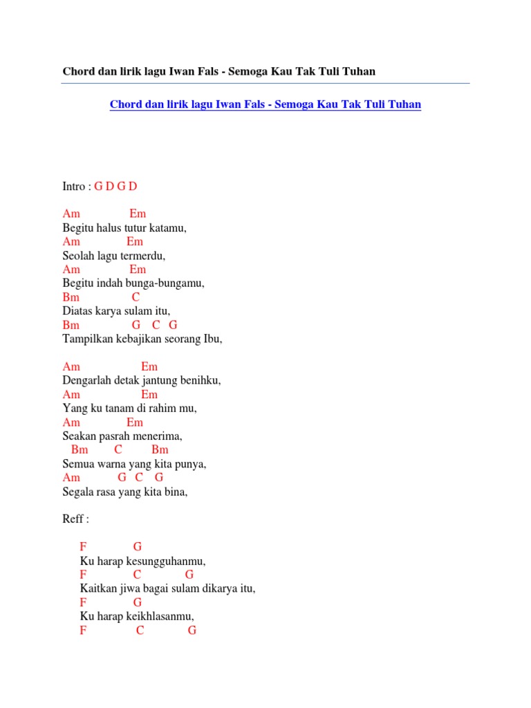 Chord Dan Lirik Lagu Iwan Fals Semoga Kau Tak Tuli Tuhan - Umur 56 tahun) adalah seorang penyanyi beraliran balada, pop, rock.